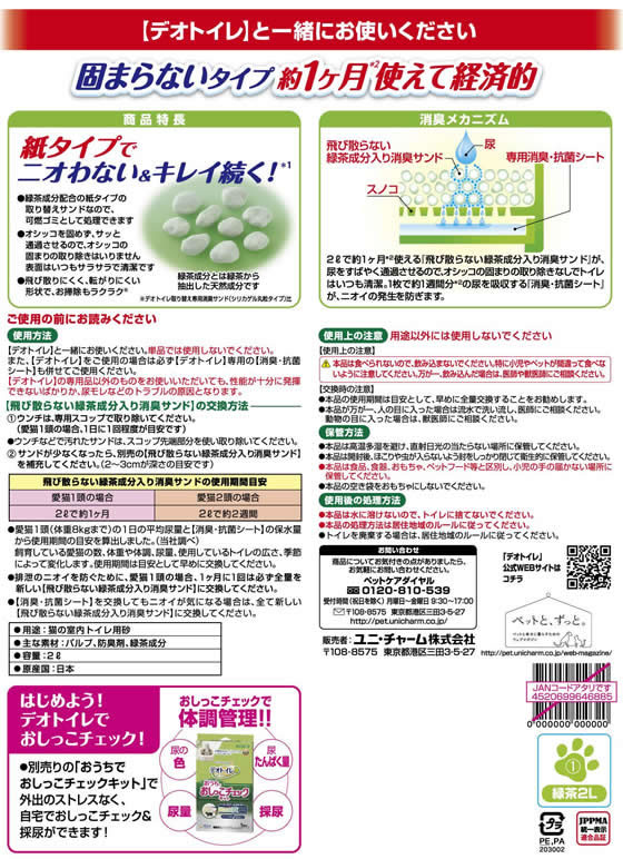 (デオトイレ取りかえ専用消臭サンド(シリカゲル丸粒タイプ)比)【仕様】●内容量:2L●緑茶成分配合●燃やせる紙タイプ【備考】※メーカーの都合により、パッケージ・仕様等は予告なく変更になる場合がございます。
